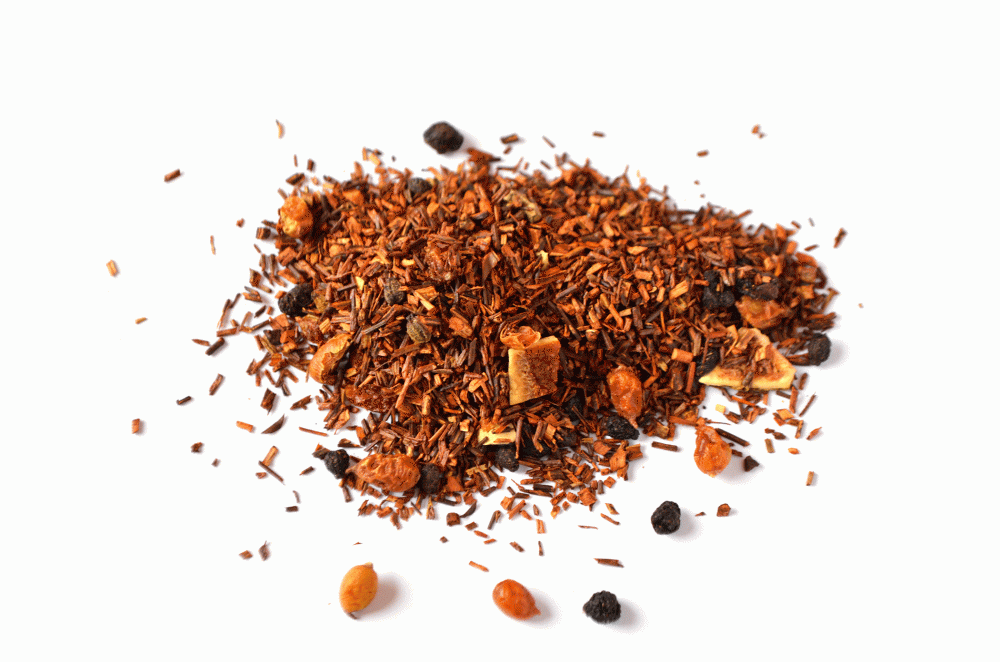 Rooibos, duindoornbessen, vlierbessen, aroma, citrusschil, sinaasappelvruchtgranulaat, (glucosesiroop, tarwe, vruchtenconcentraat, abrikozenmoes, fructose, verdikkingsmiddel E401).