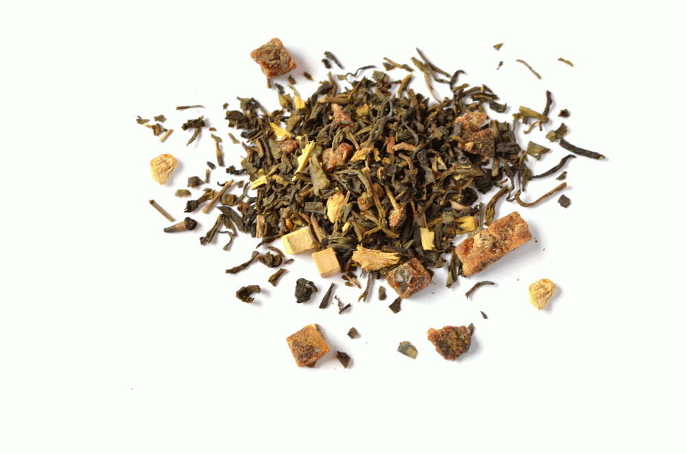 Groene thee, dadel, aroma, stukjes room karamel, koeienmelk, suiker, gluctosesiroop, tarwe, botervet, zoethout, gember, sorbitol E420, emulgator E471.