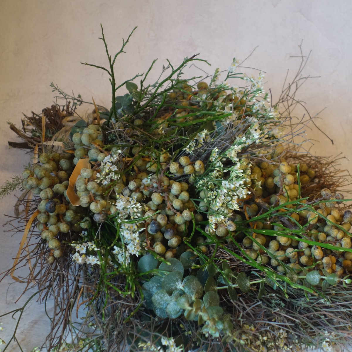 Een leuke toef met dadeltak, bosbes, statice, tijm en eucaluptus