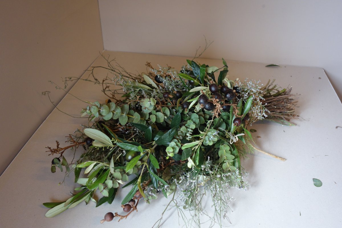 Deze toef is ongeveer 50cm. lang en hierin zit wilde thijm, olijfgroen en zwarte bes en statice verwerkt.