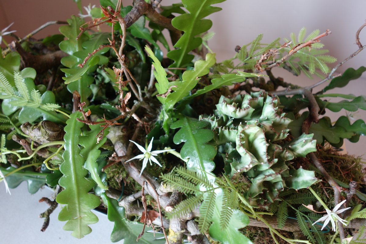 Diverse vetplanten op kunstof schaal verwerkt met hout en zijde accenten tot een mooi arrangement