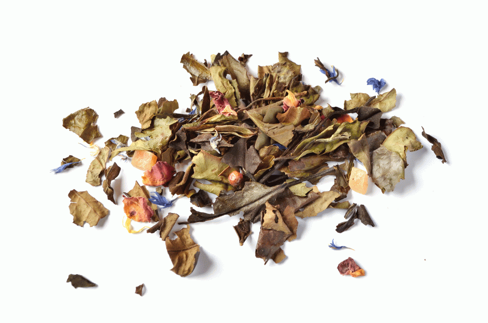 Witte thee, papaja, aroma, mango, pepertjes, peer, rode rozenbloesem, goudbloembloesem en korenbloembloesem.