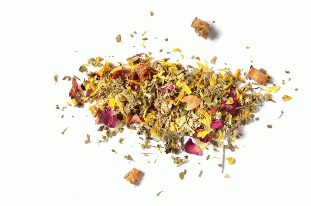 Frambozenblad, venkel, bramenblad, aardbeienblad, zonnebloembloesem, anijs, goudbloembloesem, rozenbottelschil, appel, aroma, hazelnootblad, melisseblad, weegbree, rozenbloesem, koningskers, vlierbessenbloesem en pepermunt.
