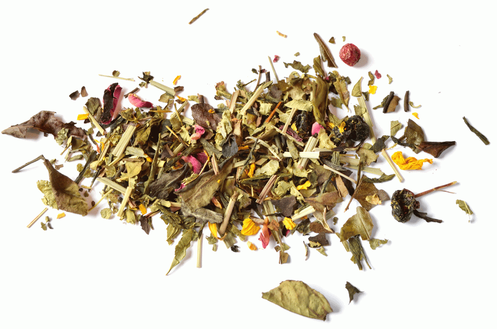 Witte en groene thee, verveine, citroengras, aroma, citroenmirthe, zwarte en rode bessen, rode rozenbloesem en zonnebloembloesem.